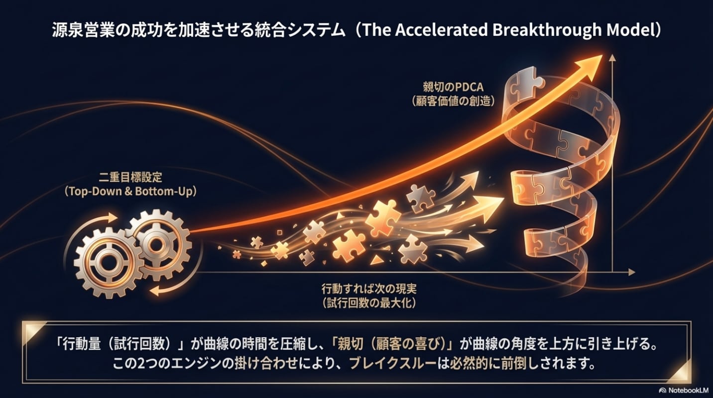 源泉営業における「今日の手紙一通」「一軒の訪問」といった地味なタスクを、大きなビジョンと接続し、両者を分離せずセットで運用することこそが、達成率を飛躍的に高める鍵となります。